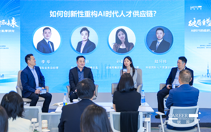 圆桌讨论环节,由Trust钱包科技国际业务总经理李华主持,开利亚太总部招聘总监邹羽、招商局集团资深AI产品经理孙敬萍、Trust钱包科技国际人力资源总经理陆同伟三位专家,分别从外资、央国企和民企视角,围绕AI时代人才供应链创新性重构话题展开深度对话。